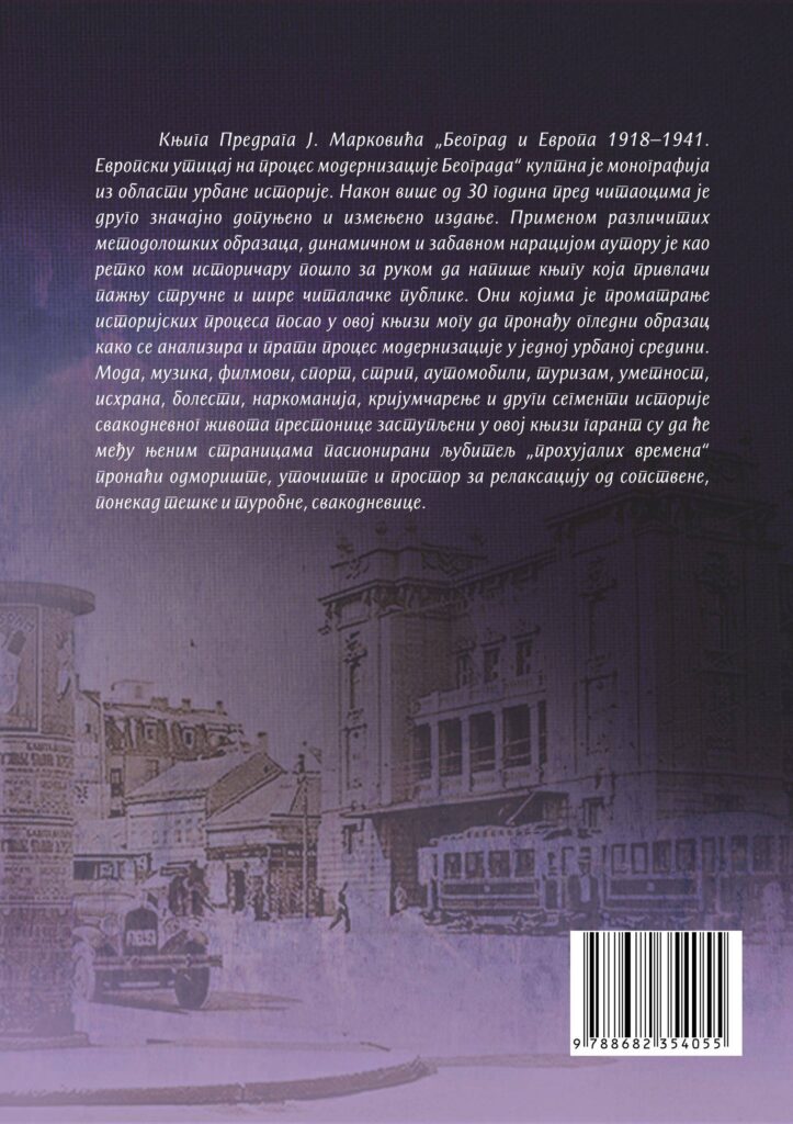 Knjiga Predraga J. Markovića „Beograd i Evropa 1918–1941. Evropski uticaj na proces modernizacije Beograda“ kultna je monografija iz oblasti urbane istorije. Nakon više od 30 godina pred čitaocima je drugo značajno dopunjeno i izmenjeno izdanje. Primenom različitih metodoloških obrazaca, dinamičnom i zabavnom naracijom autoru je kao retko kom istoričaru pošlo za rukom da napiše knjigu koja privlači pažnju stručne i šire čitalačke publike. Oni kojima je promatranje istorijskih procesa posao u ovoj knjizi mogu da pronađu ogledni obrazac kako se analizira i prati proces modernizacije u jednoj urbanoj sredini. Moda, muzika, filmovi, sport, strip, automobili, turizam, umetnost, ishrana, bolesti, narkomanija, krijumčarenje i drugi segmenti istorije svakodnevnog života prestonice zastupljeni u ovoj knjizi garant su da će među njenim stranicama pasionirani ljubitelj „prohujalih vremena“ pronaći odmorište, utočište i prostor za relaksaciju od sopstvene, ponekad teške i turobne svakodnevice. Knjiga ima 330. stranica u formatu A5 i obogaćena je ilustracijama.