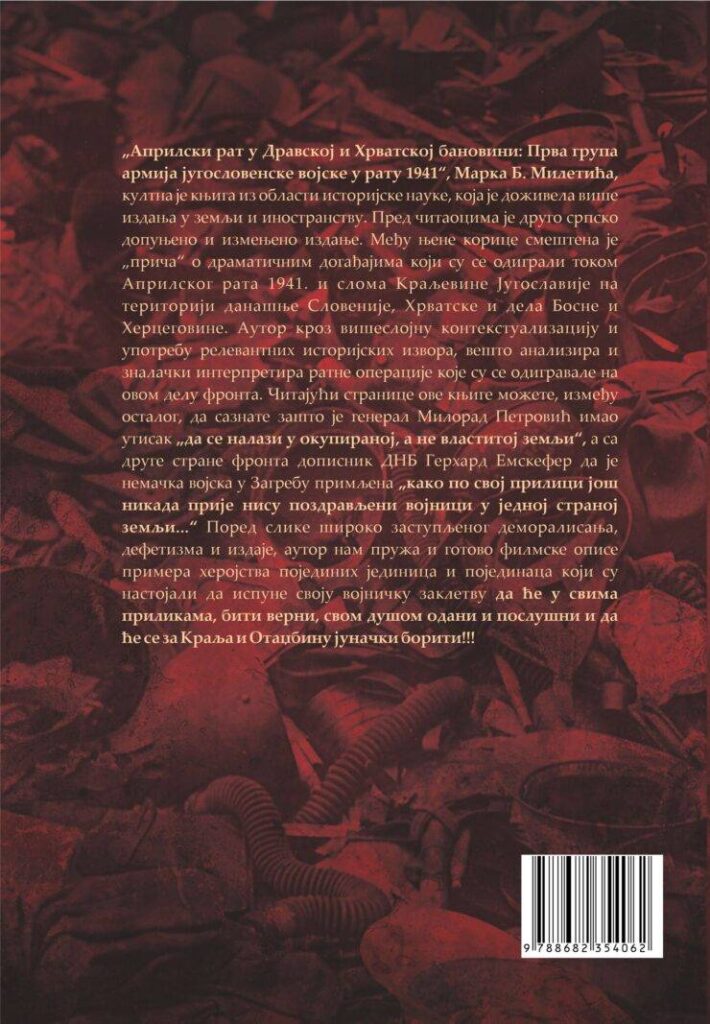 „Aprilski rat u Dravskoj i Hrvatskoj banovini: Prva grupa armija jugoslovenske vojske u ratu 1941.“, Marka B. Miletića, kultna je knjiga iz oblasti istorijske nauke, koja je doživela više izdanja u zemlji i inostranstvu. Pred čitaocima je drugo srpsko dopunjeno i izmenjeno izdanje. Među njene korice smeštena je „priča“ o dramatičnim događajima koji su se odigrali tokom Aprilskog rata 1941. i sloma Kraljevine Jugoslavije na teritoriji današnje Slovenije, Hrvatske i dela Bosne i Hercegovine. Autor kroz višeslojnu kontekstualizaciju i upotrebu relevantnih istorijskih izvora, vešto analizira i znalački interpretira ratne operacije koje su se odigravale na ovom delu fronta. Čitajući stranice ove knjige možete, između ostalog, da saznate zašto je general Milorad Petrović imao utisak „da se nalazi u okupiranoj, a ne vlastitoj zemlji“, a sa druge strane fronta dopisnik DNB Gerhard Emskefer da je nemačka vojska u Zagrebu primljena „kako po svoj prilici još nikada prije nisu pozdravljeni vojnici u jednoj stranoj zemlji…“ Pored slike široko zastupljenog demoralisanja, defetizma i izdaje, autor nam pruža i gotovo filmske opise primera herojstva pojedinih jedinica i pojedinaca koji su nastojali da ispune svoju vojničku zakletvu da će u svima prilikama, biti verni, svom dušom odani i poslušni i da će se za Kralja i Otadžbinu junački boriti!! Knjiga ima 251. stranicu u formatu B5 i obogaćena je ilustracijama.