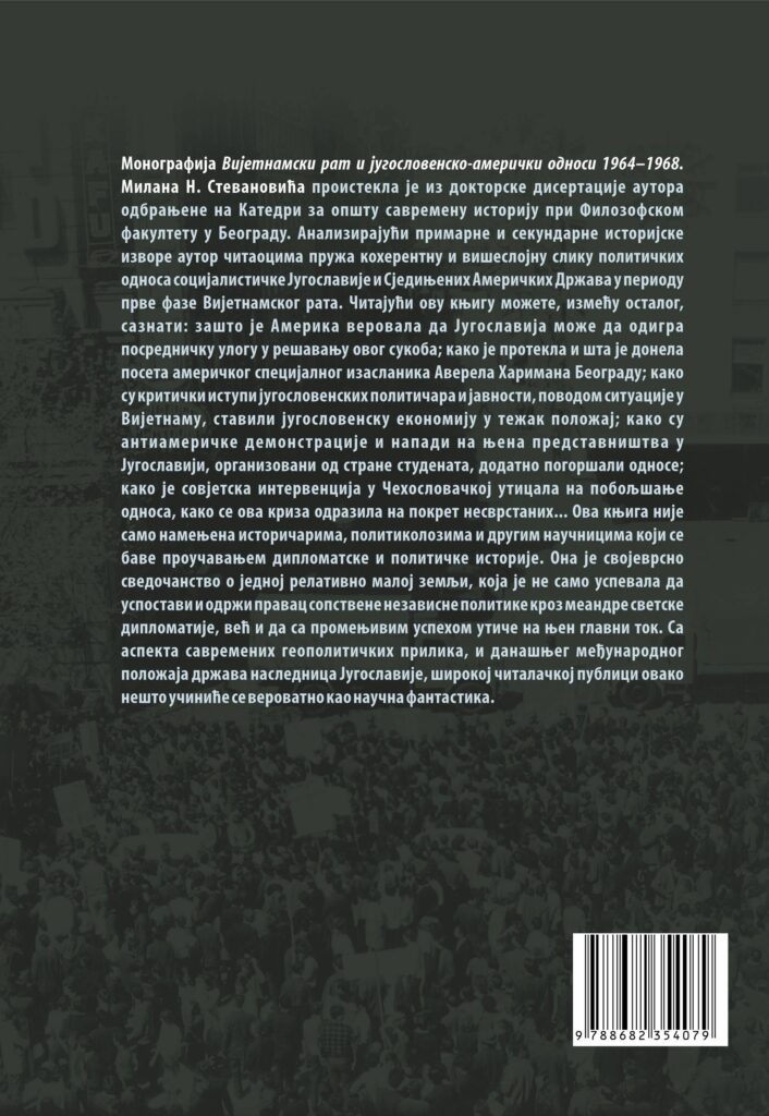 Monografija “Vijetnamski rat i jugoslovensko-američki odnosi 1964–1968.” Milana N. Stevanovića proistekla je iz doktorske disertacije autora odbranjene na Katedri za opštu savremenu istoriju pri Filozofskom fakultetu u Beogradu. Analizirajući primarne i sekundarne istorijske izvore autor čitaocima pruža koherentnu i višeslojnu sliku političkih odnosa socijalističke Jugoslavije i Sjedinjenih Američkih Država u periodu prve faze Vijetnamskog rata. Čitajući ovu knjigu možete, izmeću ostalog, saznati: zašto je Amerika verovala da Jugoslavija može da odigra posredničku ulogu u rešavanju ovog sukoba; kako je protekla i šta je donela poseta američkog specijalnog izaslanika Averela Harimana Beogradu; kako su kritički istupi jugoslovenskih političara i javnosti, povodom situacije u Vijetnamu, stavili jugoslovensku ekonomiju u težak položaj; kako su antiameričke demonstracije i napadi na njena predstavništva u Jugoslaviji, organizovani od strane studenata, dodatno pogoršali odnose; kako je sovjetska intervencija u Čehoslovačkoj uticala na poboljšanje odnosa, kako se ova kriza odrazila na pokret nesvrstanih… Ova knjiga nije samo namenjena istoričarima, politikolozima i drugim naučnicima koji se bave proučavanjem diplomatske i političke istorije. Ona je svojevrsno svedočanstvo o jednoj relativno maloj zemlji, koja je ne samo uspevala da uspostavi i održi pravac sopstvene nezavisne politike kroz meandre svetske diplomatije, već i da sa promenjivim uspehom utiče na njen glavni tok. Sa aspekta savremenih geopolitičkih prilika, i današnjeg međunarodnog položaja država naslednica Jugoslavije, širokoj čitalačkoj publici ovako nešto učiniće se verovatno kao naučna fantastika.Knjiga ima 251. stranicu u formatu B5 i obogaćena je ilustracijama.